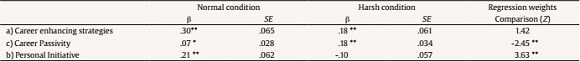 We also expect the role of personal initiative to be more salient in predicting perceived employability during harsh condition. This is because personal initiative is positively related to protean career mindset and education initiatives (such as continuing education and enrolling in self-development course etc.) ( Warr & Fay, 2001), which can enlarge ones job options and opportunities, leading to a higher employability perception. In a way, similar to career-enhancing strategies, personal initiative can signal ones propensity for personal development and may support individuals in their job search and in adapting to new work demands ( Warr & Fay, 2001), both during and after recession. In addition, individuals with initiative tend to be more proactive and are more willing to go beyond work roles to resolve work related challenges ( Frese & Fay, 2001). As such, personal initiative has been considered as an employees characteristic that contributes to organizational effectiveness ( Motowidlo & Van Scotter, 1994), which employers seek in job applicants ( Shafie & Nayan, 2010; Youth Employment Network, 2009; see also Brewe, 2003). Thus in the same vein as Frese and Fay (2001), who postulated an increase in the demand for individuals with personal initiative in competitive job markets, we hypothesize that personal initiative will gain predictive strength during harsh labor conditions when compared with normal labor market conditions ( H2b).