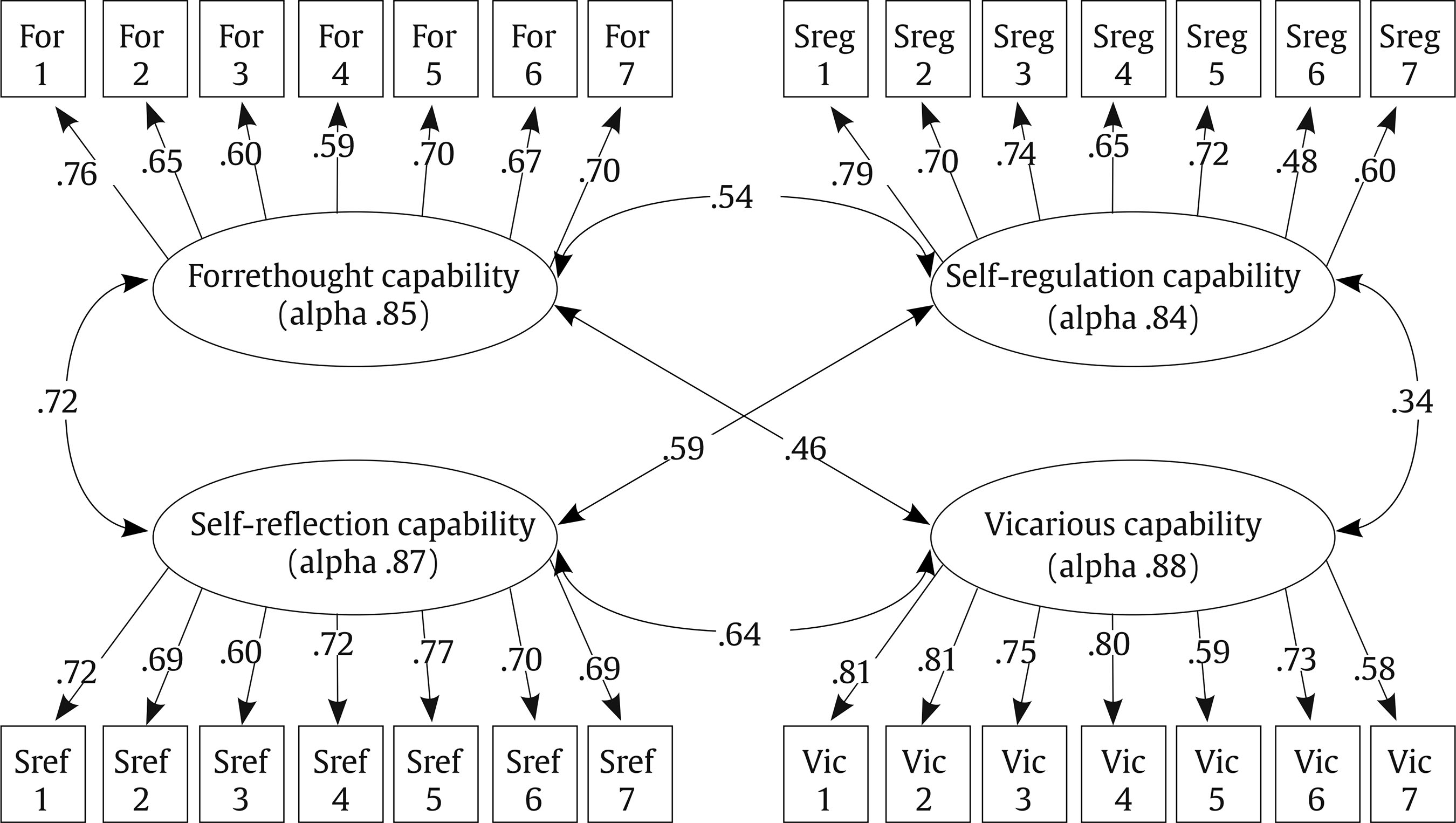 With respect to the reliability statistics (Cronbach’s alphas and item-total correlations), analysed on subsample B, they were adequate for each scale: forethought capability (seven items, Cronbach’s alpha = .85, item-total correlations ranging from .54 to .72), self-regulation capability (seven items, Cronbach’s alpha = .84, item-total correlations ranging from .44 to .69), self-reflection capability (seven items, Cronbach’s alpha = .87, item-total correlations ranging from .56 to .71), and vicarious capability (seven items, Cronbach’s alpha = .88, item-total correlations ranging from .53 to .75).
