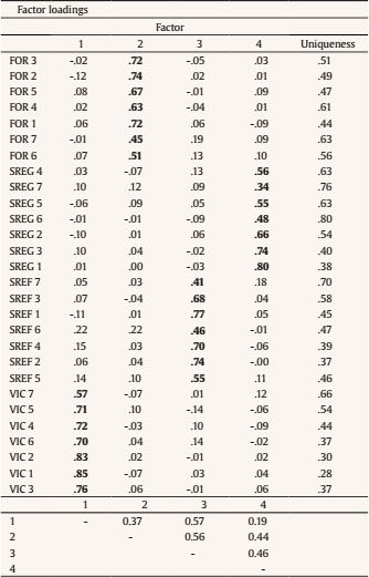 All items of the four-factor model (Table 2) mostly loaded only onto the hypothesized factors, and factor loadings ranged between |.57| and |.85| (mean = .73, SD = .09) for vicarious capability, between |.45| and |.74| (mean = .63, SD = .11) for forethought, between |.41| and |.77| (mean = .62, SD = .12) for self-reflection capability, and between |.34| and |.80| (mean = .59, SD = .16) for self-regulation capability. Correlations between factors were also found to be good, ranging from |.19| to |.57| (mean = .43, SD = .14). In terms of the correlational pattern among factors, higher correlations resulted between self-reflection capability and both vicarious capability and forethought capability (r = .58), while the lowest correlation was between vicarious capability and self-regulation capability (r = .19).