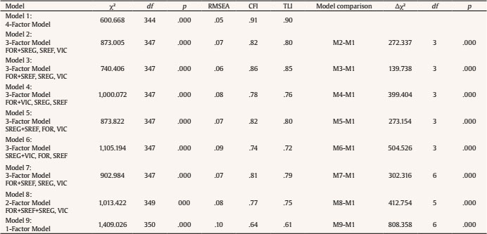 Factor loading of the four-factor model (i.e., Model 1, see Figure 1) ranged between |.59| and |.76| for forethought capability, between |.48| and |.79| for self-regulation capability, between |.60| and |.77| for self-reflection capability, and between |.58| and |.81| for vicarious capability. Correlations between factors were also found to be good, ranging from .34 to .72.