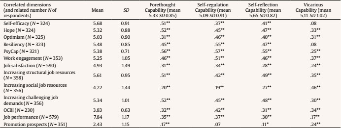 As expected, the four agentic capabilities were positively correlated with positive agentic states (see Table 4), namely self-efficacy, hope, optimism, and resiliency (with the exception of correlations between vicarious capability and both self-efficacy and resiliency, that resulted not significant), and with the overall level of PsyCap. Correlations between PsyCap and the three dimensions of forethought capability, self-regulation capability, and self-reflection capability were strong (ranging from .55 to .57). Moreover, the four agentic capabilities were positively correlated with work engagement, job satisfaction, crafting behaviours (i.e., increasing structural job resources, increasing social job resources and increasing challenging job demands), organizational citizenship behaviours toward individuals, and perceived performance. Finally, agentic capabilities were also positively correlated with perceived promotion prospects, except for self-regulation capability.