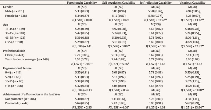 The five panels of Table 5 present the significant differences in the mean values of agentic capabilities among subgroups related to gender, age, professional role, organizational tenure, and achievement of a promotion in the last year.