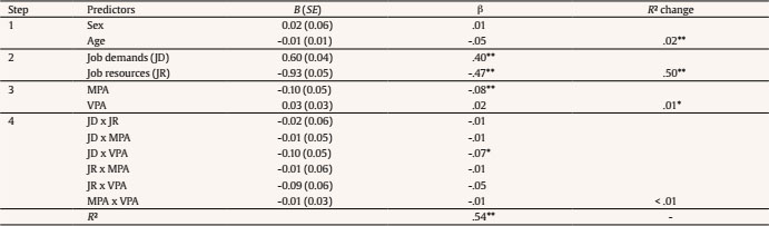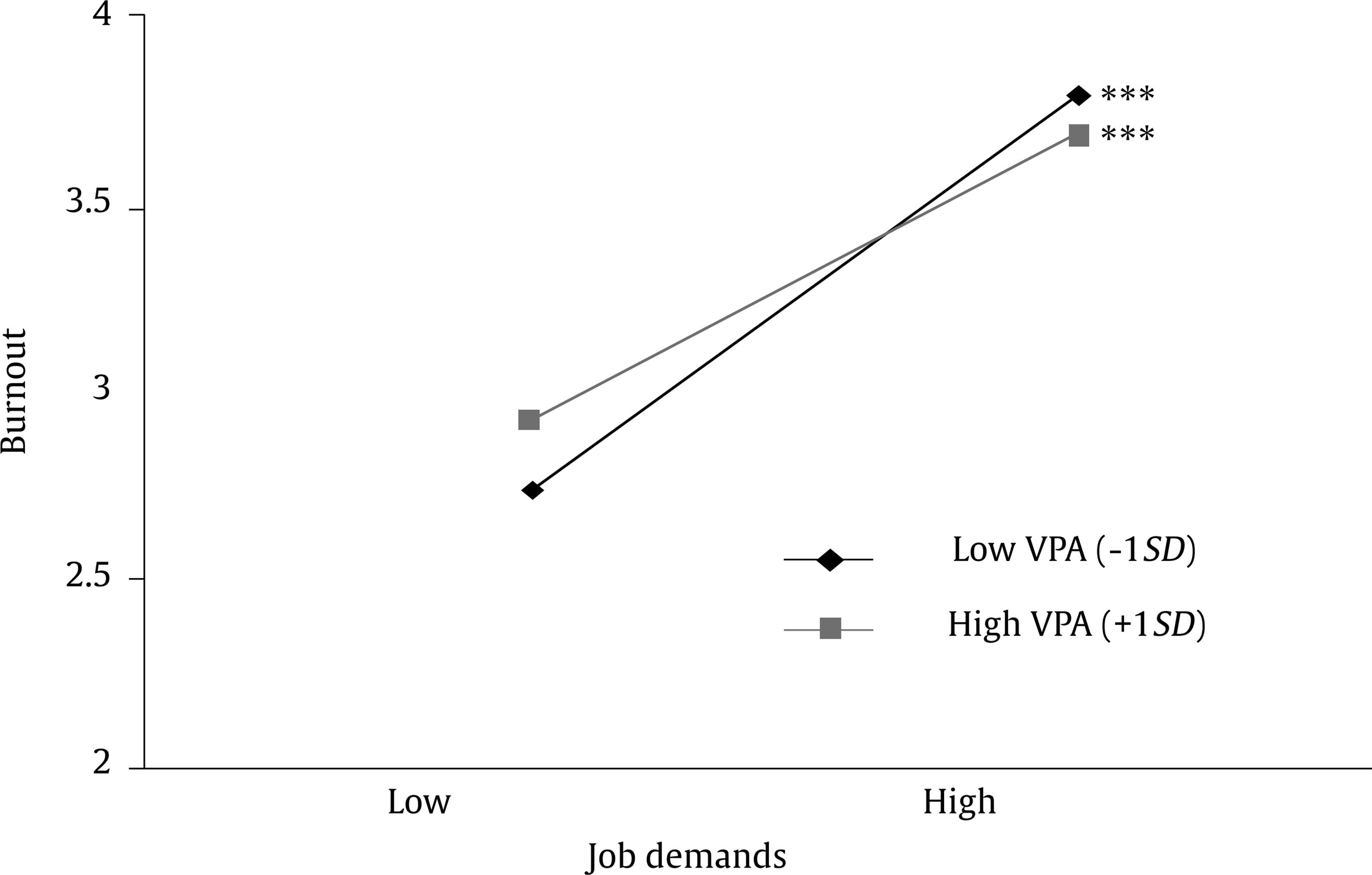 Moderation Effect of VPA on the relationship between job demands and burnout buffer hypotheses 4a and 4b were tested by the interaction effects of job demands and MPA or VPA on burnout, respectively. Therefore, two-way interactions of the study variables were tested in the final step 4 of the regression (see Table 3). In line with hypothesis 4a, the interaction term of job demands and MPA did not reach significance (b = -.01, ns). In line with hypothesis 4b, the interaction term of job demands and VPA was the only significant two-way interaction with a negative effect on burnout (a = -.07, p < .05). However, the interaction effects did not explain additional significant outcome variance in the model (ΔR2 = .01, ns). Simple slope analysis revealed that job demands significantly related to burnout in participants with lower levels of VPA (- 1SD), and still, but slightly lower in participants with high values of VPA (+ 1SD) (see Figure 1).