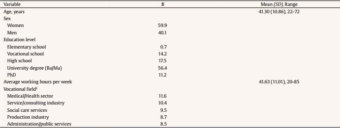Background information of the remaining N = 847 employees are depicted in Table 1. The sample characteristics did not represent the general working population in Germany: the proportion of women as well as the average education level is higher in our sample. Furthermore, the sample’s distribution over the vocational fields did not represent the working population. Nevertheless, the sample represents a broad range of different working adults across various occupational fields in Germany.