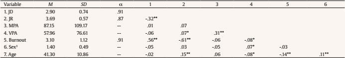Burnout. Two subscales from the German short version of the MBI were used (Büssing & Glaser, 1998): both emotional exhaustion (Cronbach’s a = .90) and cynicism (Cronbach’s a = .89) consist of 5 items and range from never (1) to very often (6). Combined, for the two scales Cronbach’s a was .91. Means, standard errors, and correlations of all variables are provided in Table 2. The third subscale of the MBI, professional inefficacy, was not assessed since it is a consequence of lacking job resources rather than emerging from high job demands such as emotional exhaustion and cynicism (see Maslach et al., 2001). Correspondingly, only emotional exhaustion and cynicism were relevant for our hypotheses.