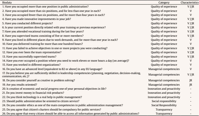 In stage one (focus group), we found 26 biodata items, which are shown in Table 2. The research team analyzed the content of this biodata, and classified them into five categories: (1) quality of experience, composed of the first fifteen items (e.g., “Have you delivered training for more than one hundred hours?”); (2) managerial competences, composed of four items, from the 16th to the 19th (e.g., “Do you consider yourself as creative when problem solving?”); (3) innovation and proactivity, from the 20th to the 22nd (e.g., “Do you think technology is a real help in public management?”); (4) social responsibility, composed of items 23 and 24 (e.g., “Should Public Administration be oriented to citizen service?”); and finally (5) transparency, with the two remaining items, 25 and 26 (e.g., “Do you agree that citizen’s charters should be compulsory for public services?”).