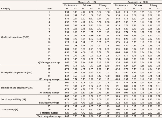 In stage two, all the biodata previously identified in stage one were applied to both managers and applicants. Respondents assessed their perception of each biodata in terms of performance, fairness, and privacy. The list of descriptive statistics of the items (M, SD) can be found in Table 3. As we can see, none of the items succeed in simultaneously fulfilling all of the requirements of job performance relatedness, fairness, and privacy. For example, item 17 is considered by managers as high in relation to job performance (M = 4.75) and fairness (M = 4.67), but one of the lowest in terms of privacy (M = 2.92). There are some discrepancies between managers and applicants. For example, item 17 was scored by managers as high in job performance (M = 4.75), high in fairness (M = 4.67) but low in privacy (M = 2.92), while applicants scored it high in job performance (M = 4.36), average in fairness (M = 3.70), and high in privacy (M = 4.04).