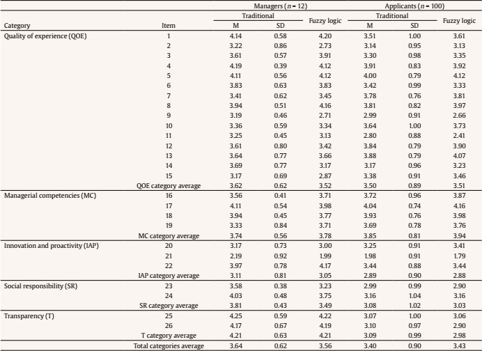 After studying each criterion, we elaborated a composite measure including all the criteria, that is, performance, fairness, and privacy (i.e., perceived face validity) using two different methods: (1) traditional approach (i.e., mean value of the three criteria) and (2) fuzzy logic (i.e., applying fuzzy rules). The results shown in Table 4 once again demonstrate that managers report higher scores than applicants. For example, mean values are 3.64 (traditional approach) and 3.56 (fuzzy logic) for managers, while mean values for applicants are 3.40 for traditional and 3.43 for fuzzy logic. If we only trust the traditional method, we can choose items that score the mean or higher in both the manager and applicant sample, i.e., items 1, 4, 5, 6, 8, 13, 17, 18, and 22. Applying the same rationale for fuzzy logic, the items are 1, 4, 5, 8, 13, 16, 17, 18, 19, and 22. Both approaches agreed on 8 items (i.e., 1, 4, 5, 8, 13, 17, 18, and 22) which represents 30.77% of the total biodata items. Most of these are verifiable and job-related, except item 18, which is non-verifiable, and item 22, which is neither verifiable nor related to the work setting. Similarly, most are related with the quality of experience category and none belong to the social responsibility or transparency categories.