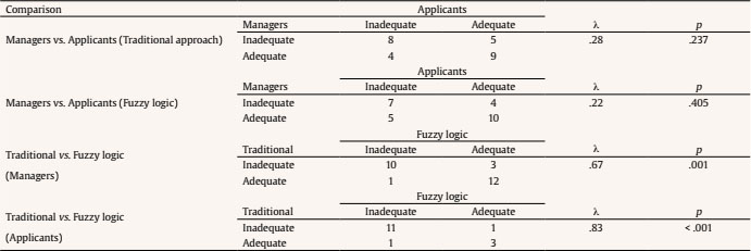We then made four comparisons: two comparisons between participants scores (managers vs. applicants), depending on the approach (traditional vs. fuzzy logic), and two comparisons between the approaches, depending on the type of participants who score. The results of the comparisons are shown in Table 5. As can be seen, managers and applicants performed different classifications, irrespective of the approach used (traditional or fuzzy), but there is an association between the type of participants according with the approach, i.e., the classification performed by managers using traditional and fuzzy methods (λ = .67, p ≤ .001), and by applicants (λ = .83, p ≤ .001) using both methods. These results indicate that managers and applicants are scoring in a substantially different way, and that the fuzzy approach is able to refine the scoring method in both collectives.