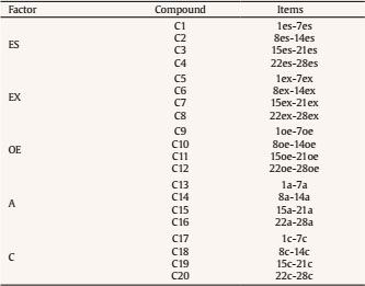 For the statistical analyses, the 140 items that make up the QI5F_tri questionnaire were grouped arbitrarily (it was not done randomly in the strictest statistical sense) into 20 clusters or compounds. Each cluster included 7 items from the instrument that evaluated the same personality factor. Thus, the 28 items that evaluated each personality factor were divided into 4 compounds of 7 items each one. This item grouping procedure was applied to the data obtained in the two experimental conditions (honest and faking) of the different samples analyzed (total, within- and between-subject sample). Table 1 shows the compounds created.