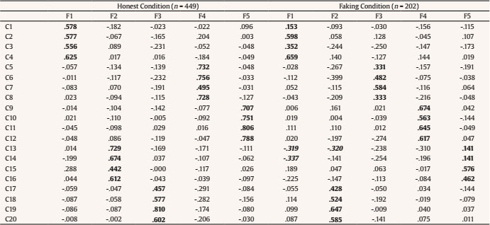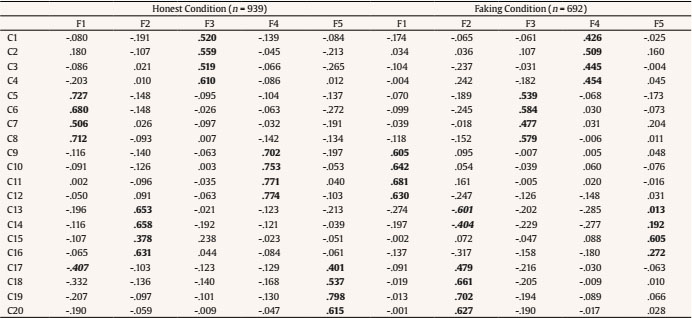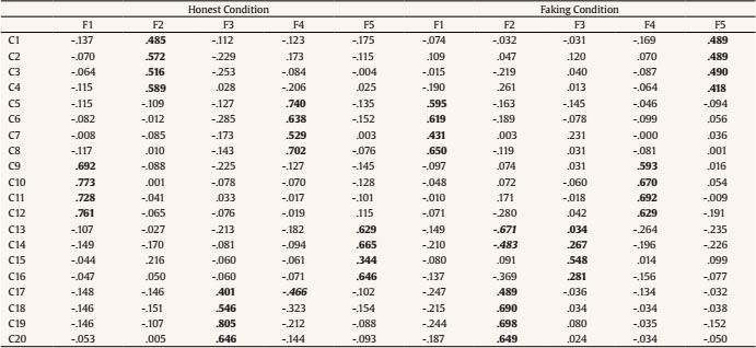 Again, in the honest condition, results showed that all the clusters loaded on their hypothetical factor, with relevant and positive loadings, and that they did not present positive secondary loadings on the remaining factors. It can also be seen that the remaining loadings for each factor were not significant and most of them were negative. The results under faking instructions, once again, showed that data fits a factor structure of five orthogonal factors. However, three of the compounds (C1, C13, and C14) showed a factor loading which was not significant on the factor that they would be expected to load, although they did not load significantly on any other factor.