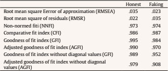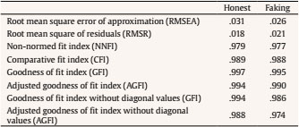 Model fit indices obtained in the within-subject design are summarized in Table 5. In the honest condition, model fit values found were similar or slightly better than values found in the total sample, although differences have no practical relevance since they occurred in the thousandth values. In the faking response condition, indices were also good or excellent, although slightly lower than those of the total sample. Then, it must be taken into account that the sample size was much smaller in the present case, with results in greater sampling error.