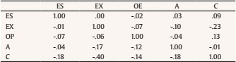 Results of the factor loads matrix in the honest condition replicated the factor structure shown for the total sample with notable similarity and, therefore, comments made in the case of the total sample are entirely applied to the present case. That is, all compounds had their highest positive loading on the expected factor. Thus, the five-factor structure has been supported by the data. In the case of the factor load matrix obtained under faking conditions for this design, results were very similar to those obtained for the same condition with the total sample. The five-factor structure was clearly supported by the data, although the magnitude of loads was slightly less in faking conditions than in honest conditions. Moreover, again, two of the agreeableness compounds, C13 and C14, showed reduced loadings on the factor that they would be expected to load (factor 3), with values of .034 and .267, respectively, and negative loadings on the consciousness factor (factor 2), with values of -.671 and -.483 for these clusters.