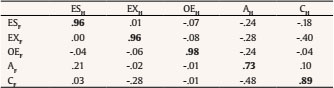Table 8 presents Burt-Tucker’s congruence coefficients calculated for each pair of factors in each of the two experimental conditions analysed (honest and faking). The top of the table shows Burt-Tucker’s congruence coefficients for the faking condition and coefficients for the honest condition are presented at the bottom of the table. As can be seen, the results found showed very low coefficients between divergent factors in both honest and faking conditions. In all cases, values of Burt-Tucker coefficients between divergent factors were equal to or less than .40. Therefore, based on these results, factor structure remains stable in the FC inventory despite the effects of faking.
