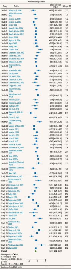 In coding the effect sizes, there were several instances in which the effect size included in the current study reflects a weighted average. Most commonly, there were several studies that reported separate effect sizes for associations between instrumental family/partner support and emotional family/partner support and the various measures of the work-family interface. In these situations, the two effect sizes were averaged to obtain a single effect size. There were several instances where effect sizes were reported separately for men and women; in these instances, given the differing sample sizes, a weighted average was calculated. Further, there were two instances where the study reported effect sizes for both husbands and wives in dual-earner relationships. The husbands and wives scores were averaged together to account for the interdependence between them.