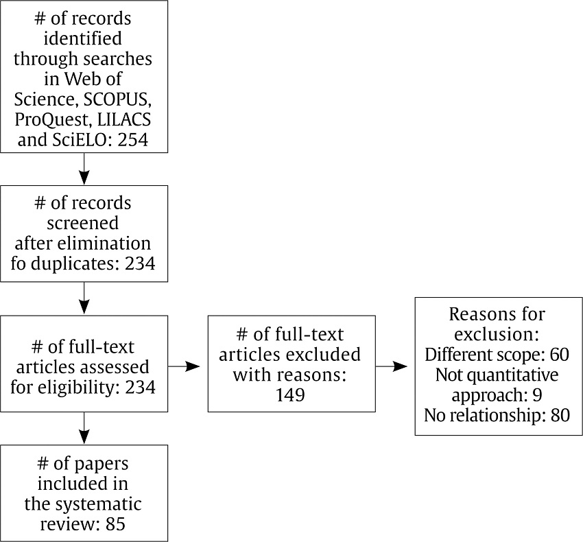 Following Lipsey and Wilson (2001), to minimize publication bias, we did not limit our searches exclusively to journal articles but also included book chapters, dissertations, technical reports, and conference proceedings. Eligible studies had to (a) be published in either English or Spanish1, (b) be conducted in a Latin-American country, (c) be published in the 2010-2021 period, (d) provide empirical evidence (for this reason other types of articles, such as editorial letters, were excluded), and (e) involve human participants who were active workers or were in some kind of an employment relationship (other types of human subjects, such as students, were excluded from the systematic review). This procedure resulted in the identification of 254 articles (234 after the elimination of duplicates; see Figure 1). Further, we proceeded to eliminate those articles that either (a) did not focus on a topic related to psychosocial risks, (b) were not conducted by following a quantitative approach, or (c) did not empirically examine a relationship or association between a measure of psychosocial risks and a measure of health or between a measure of psychosocial risks and a measure of performance. The aforementioned combination of strategies resulted in the identification of 85 papers for analysis. A reference list of studies included in the present analysis can be found in the References section.