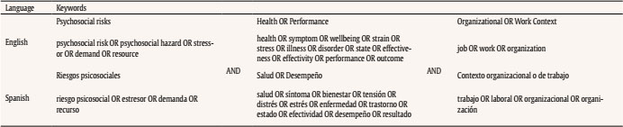 To maximize the chances of identifying all relevant research on psychosocial risks, health, and performance in Latin-American countries, we performed separate searches in five electronic databases, including the Web of Science (WoS), Scopus, ProQuest, LILACS (Latin American and Caribbean Health Sciences Literature), and SciELO (Scientific Electronic Library Online) following guidelines in Moher et al. (2009). We introduced different combinations of keywords in both English and Spanish in advanced searches limited to the title, abstract, and descriptors. This set of keywords was selected to reflect the different ways in which the constructs ‘psychosocial risks’, ‘health’, and ‘performance’ have appeared most commonly in the literature, such as ‘stressors’, ‘well-being’, and ‘effectivity’, respectively (see Table 1). It is worth mentioning that these keywords did not intend to reflect any theoretical model in particular, but rather were sufficiently wide in scope to enable the identification of a large number of studies on the topic. Moreover, to select the most recent developments in the field, we prioritized research conducted in the last ten years (2010-2021).