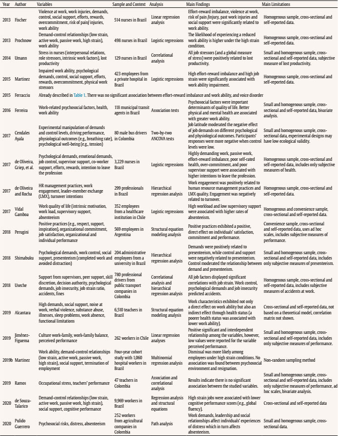We then conducted a critical analysis of the papers that were included in the systematic review in order to evaluate the most recent advances in the literature on psychosocial risks, health, and performance in Latin America to identify the main limitations of the field and to propose relevant and attractive avenues for future research. Each article was analyzed separately and then described in terms of how the constructs of interest were operationalized, the statistical techniques used to examine the proposed relationships, the characteristics and size of the sample (or samples) collected to test the models, and their main findings and limitations (see Tables 2 and 3).