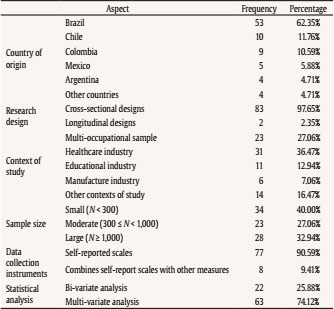 The combination of strategies described in the previous section resulted in the identification of 85 papers. Table 4 provides an overall characterization of these studies in terms of the countries where they were conducted, their research design, the context and sample in which the data were collected, the kind of instruments that were used to measure the variables of interest, and the statistical techniques that were applied to test their hypotheses. These aspects are further discussed in the following sections.