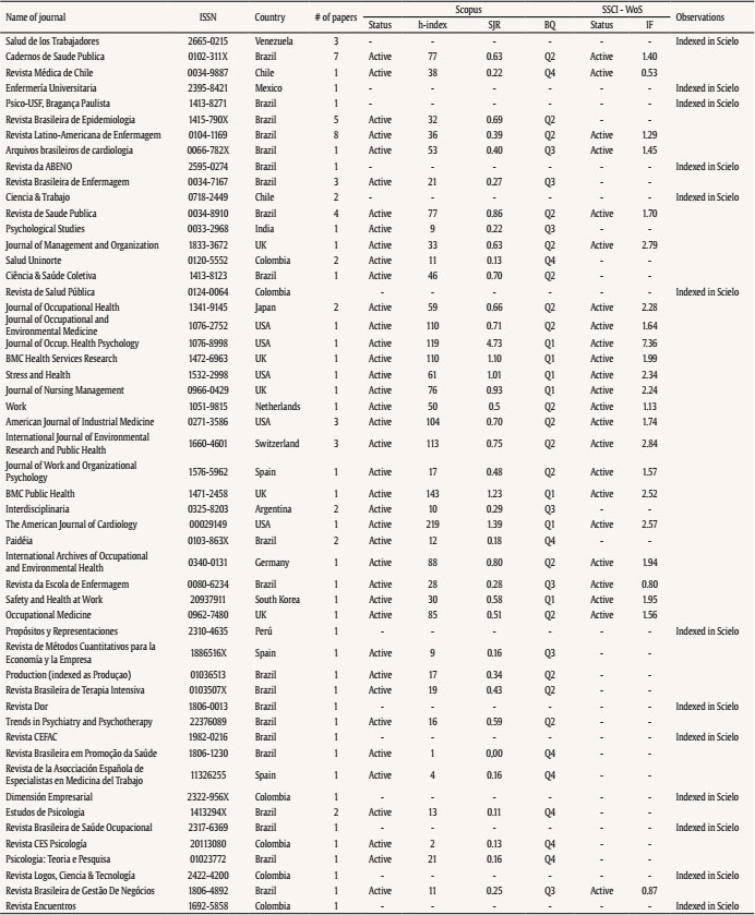 Bibliometric impact.Table 5 provides an assessment of the bibliometric impact of the 52 journals in which the 85 selected papers of the review were published. Most of these journals are from Latin-American countries (63.46%), and the remaining ones from European countries (19.2%), the USA (9.6%), and Asian countries (5.7%). Of the Latin-American journals, Brazil concentrates 63.6% of the scholarly productivity in the field, followed by Colombia with 18.1%. Moreover, while a few journals are only indexed in either Scielo (25%) or Scopus (30.8%), most journals are indexed in both Scopus and WoS (44.2%). Sixty-one point five percent of those papers found in journals indexed in WoS and/or Scopus were published in the highest two quartiles according to the 2019 H-Index of the Scimago Ranking, and 38.5% were published in Q3 and Q4 journals. Finally, only 28 papers were published in Q2 Latin-American journals, while none of the Q1 journals belong to Latin-American countries (USA = 3, UK = 3, and South Korea = 1).