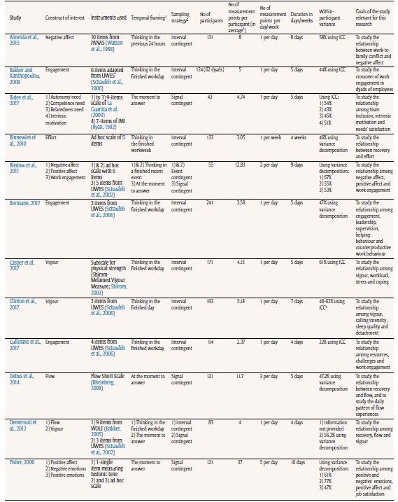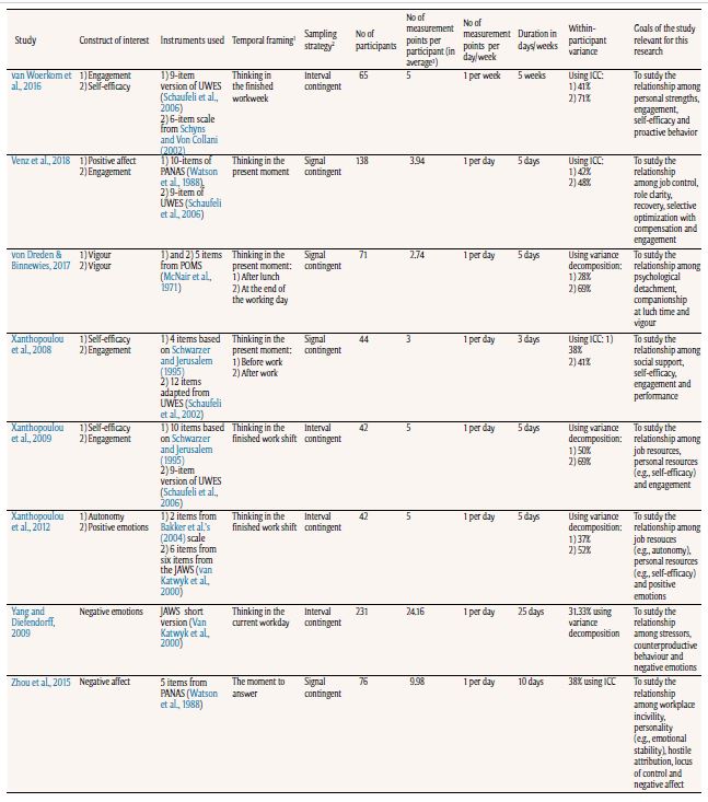 As we can see in Table 1, the variables that we encountered more often in the studies were engagement (20%), positive affect (14%), negative affect (10%), and vigour (10%). All other 16 variables were found in less than 10% in the studies (please refer to Table 1 for detailed information on the frequency of all 20 constructs). Regarding the sample size used, the average was 96 participants (range = 27 to 256, SD = 54.08), with an average of 14.54 repeated assessments per participant (range = 2.37 to 73.59, SD = 14.98). The average number of measurement points collected per day/week2 was 2.02 (range = 1 to 6, SD = 1.50) with the average total duration of the data collection over 10.62 days/weeks (range = 3 to 50 days/weeks, SD = 8.07). Regarding sampling strategy, 57.1% used signal contingent (i.e., collecting the measurement points randomly over time), 36.9% used interval contingent (i.e., collecting the measurement points at specific times, usually at the end of the day), and only 6% used event contingent (i.e., collecting the measurement points once some specified event happened). Finally, the average proportion of within-person variance for the work motivation variables was 51.9% (range = 13.6% to 88%, SD = 16.24) weighting by sample-size of each study.