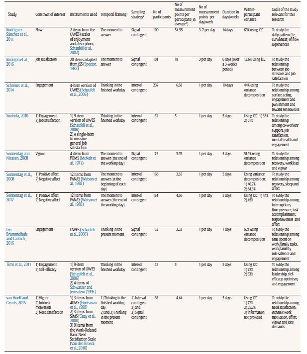 In spite of having used a wide variety of terms for motivation-related constructs in our search of the literature (i.e., work motivation, work engagement, flow, mood, self-efficacy, affect, goal setting, goal striving, psychological needs, and expectancies), it is noteworthy that only some of these constructs have been the focus of attention in studies designed to estimate within-participant variance. For example, classic constructs in the field of motivation such as expectancies and goal-setting did not emerge in any of the studies we found. However, other motivational constructs such as engagement, affect (i.e., mood and emotions), vigour, and flow, for example, have received more attention in published work seeking to understand within-participant changes in motivation.