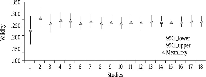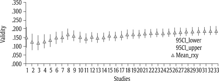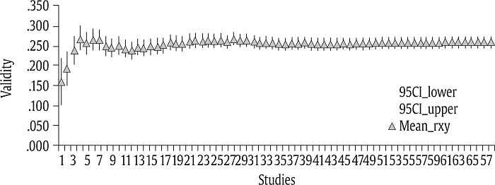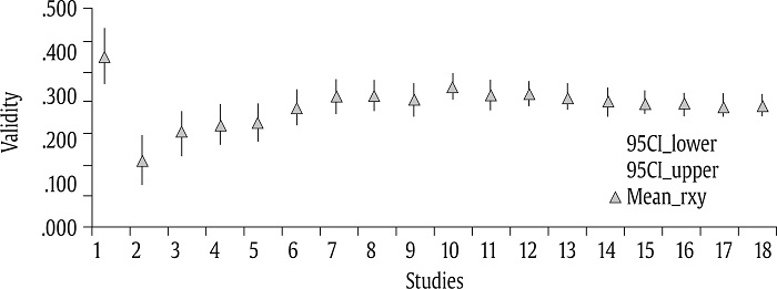 Our third method of analyzing publication bias was cumulative meta-analysis (CMA). There is broad agreement that CMA is the most robust technique for detecting publication bias (Borenstein, 2005; Kepes et al., 2012; Schmidt & Hunter, 2015). CMA consists of a series of meta-analyses in which new correlations are added one-by-one and a new average correlation is obtained with the addition of each new validity. Borenstein (2005) and Schmidt and Hunter (2015) posited that the studies should be ranked from the study with the largest sample size to the study with the smallest sample size. In the present case, the average correlation and its standard error are calculated, and a moving forest plot is developed. The absence of publication bias is observed when a sustained line is described after studies are added.