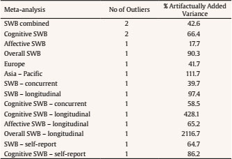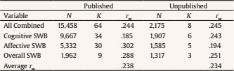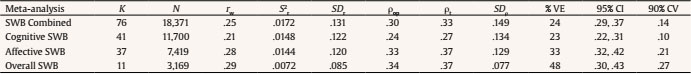 SWB reliability. The reliability of overall SWB, cognitive SWB, and affective SWB was estimated using the internal consistency reported in the primary studies. When a study did not report the reliability, we used the average value of the reliability distribution of all combined studies (rxx = .81) as the study reliability. Next, we developed an empirical distribution for overall SWB, Cognitive SWB, and affective SWB. Descriptive statistics of the specific distributions for each meta-analysis appear in Table 3.