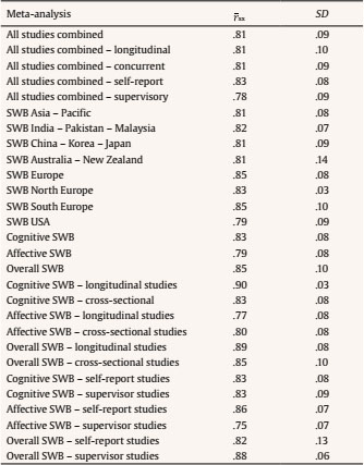 ABSTRACT: This meta-analysis examined the differences across countries/regions, and the moderator effects of the study type (cross-sectional vs. longitudinal) on the SWB-job performance relationship. The database consists of 78 independent samples (N = 18,853), located through electronic and manual searches. The results showed that overall SWB (ρ = .37), cognitive SWB (ρ = .27), and affective SWB (ρ = .37) are predictors of job performance. Evidence of cross-cultural effects showed that the magnitude of the SWB-job performance relationship was larger in the Asia-Pacific region than in Europe and the US-Canada region (Asia-Pacific ρ = .41, Europe ρ = .33, USA ρ = .23). Moderator analyses indicated that, on average, cross-sectional (concurrent) and longitudinal (predictive) studies showed similar validity (ρ = .33 vs. ρ = .32). Lastly, we discuss the main contributions, and some practical implications and some limitations of the study are mentioned.