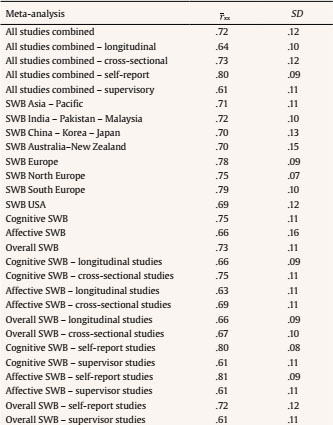 The main finding is that SWB is moderately correlated with job performance, independently if it is measured as affective SWB, cognitive SWB, or as overall SWB. In the second place, all the meta-analytic estimates of validity showed that affective SWB was more highly correlated with job performance than cognitive SWB. In third place, the relationship between SWB and job performance varies depending on the cross-cultural regions, being higher for the Asia-Pacific region than for Europe and the USA. The findings also revealed that the type of design moderates the relationship between SWB and job performance.