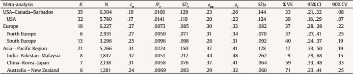Table 7 reports the results of the meta-analyses for the three big cross-cultural regions. The order of the columns in Table 7 is the same as in the previous Table. The group USA-Canada is the most represented in the database and contains 35 studies. Europe and the Asia-Pacific region are similarly represented with 19 and 21 studies, respectively. However, the total sample size is bigger in Europe than in the other two groups.