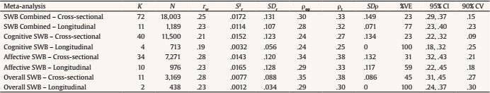 The 90% CVs were positive and considerably different from zero in all the cases, which indicates that the relationship of SWB and its components generalizes across studies for both the cross-sectional and longitudinal designs. However, the size of the generalizability is larger for the longitudinal designs than for the cross-sectional designs.