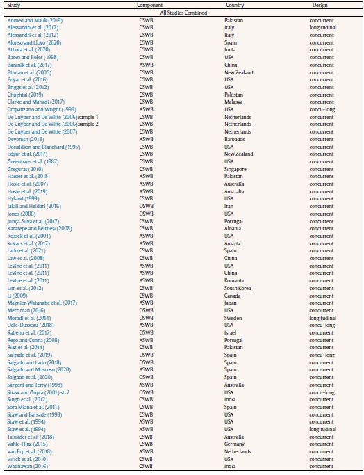 For the Meta-Analysis Reporting Standards (MARS) specified in the Publication Manual of the American Psychological Association (2020; available at https://apastyle.apa.org/manual/related/JARS-MARS.pdf) and the Preferred Reporting Items for Systematic Reviews and Meta-analysis (PRISMA), Table 1 contains the following information from each study for each job performance category: (1) study source, (2) SWB component, (3) country, and (4) design study (concurrent vs. longitudinal).