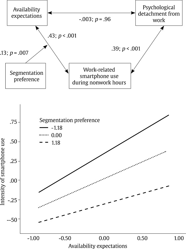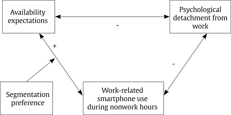 This study aimed to examine a complex model describing the relationships among availability expectations, work-related smartphone use during non-work hours, work-to-home segmentation preference, and psychological detachment.