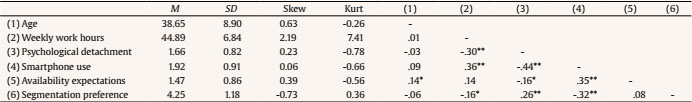 Conversely, a moderately strong correlation was found between weekly work hours and psychological detachment (r = -.30, p < .001); because weekly work hours did not have a normal distribution, we added Kendall’s correlation coefficient: τ = -.24, p < .001. However, respondents could have included even the hours they spent working on their smartphone outside of their work hours, which would lead to the variable having shared variance with work-related smartphone use. Therefore, we decided not to consider weekly work hours in our analyses.
