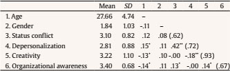 Age and gender were added as control variables, because of their possible effect on status. Age has the potential to affect performance through conflict (Jehn et al., 1999). Gender was controlled, because our sample contained 70% of females mostly nurses, which could potentially affect status and creativity.