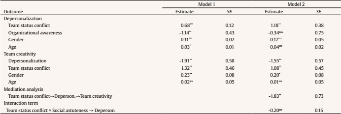 Team was the level of analysis in this study where status conflict and creativity at level-2 were analyzed. Thus, a multilevel analysis was used to assess the 2-1-2 relationship (Preacher et al., 2010) due to its better choice from “micro-to meso-theory testing” (Klein & Kozlowski, 2000). This study aims to understand the configural team properties (i.e., status conflict and team creativity) and a typical bottom-up model is appropriate for conceptual and theoretical understanding of how team level construct contribute to individual-level constructs and later it contributes to the team properties. We aggregated the responses of team members on status conflict and creativity at team level to assess the relationship with random intercepts and slopes (vary across teams), while intraclass correlations coefficient for depersonalization (ICC1 = .27, ICC2 = .62) and social astuteness (ICC1 = .07, ICC2 = .26) represents small to medium effect (LeBreton & Senter, 2008, p. 838).