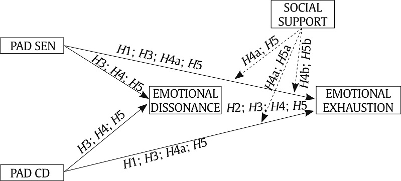 H4: Emotional support moderates the relationship established between (a) attention to diversity and emotional exhaustion and (b) dissonance and emotional exhaustion.