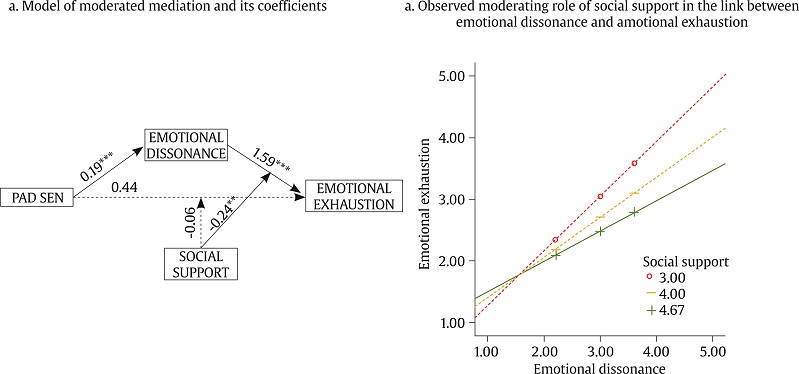 Moreover, the results also confirmed H4b: emotional support moderated the relationship established between emotional dissonance and emotional exhaustion. When emotional dissonance levels were high, emotional exhaustion was elevated, consistently with previous research (Diestel & Schmidt, 2011; Heuven & Bakker, 2003; Karatepe & Dare Aleshinloye, 2009; Kenworthy et al., 2014; Molino et al., 2016; Van Dijk & Kirk Brown, 2006). However, higher levels of social support lowered the effect of emotional dissonance on emotional exhaustion. These results are consistent with previous studies that have presented social support as a moderator of the relationship of different variables with emotional exhaustion or burnout (Heaney & Israel, 2008; Marenco Escuderos & Ávila Toscano, 2016). Thus, once again, the results highlight the relevance of social support in the psychosocial intervention oriented to reduce emotional exhaustion in teachers.