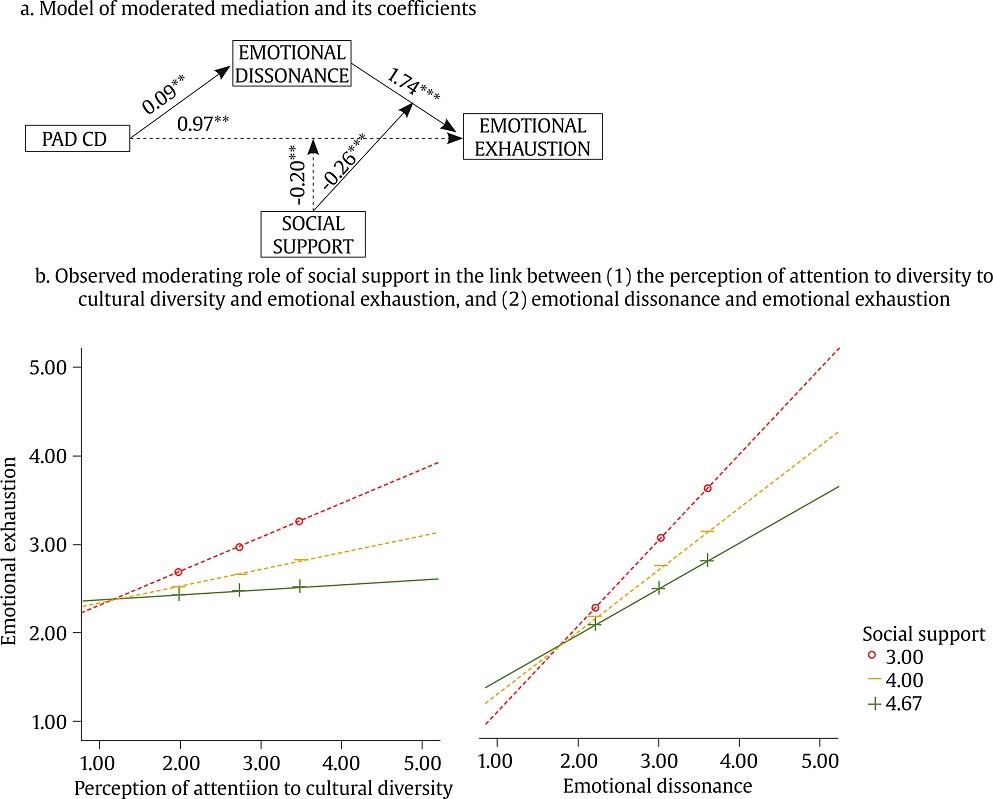 Moreover, mediational analyses also show that the relationship between perception of attention to cultural diversity with emotional exhaustion also depend on social support levels, as we will explain more in depth later. Although a direct relationship was found when social support levels were low or average, with a high level of social support, the perception of attention to cultural diversity did not directly impact emotional exhaustion. Thus, social support seems to be a relevant variable to consider in psychosocial interventions oriented to emotional exhaustion, as it buffers the negative effect of perception of attention to cultural diversity on emotional exhaustion.