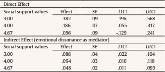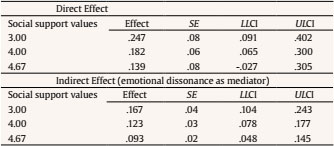 a) Emotional dissonance mediated the relationship established between perception of attention to SEN and emotional exhaustion. The conditional effects (see Table 1) show that the mediating role of emotional dissonance remained at all values of the moderator.