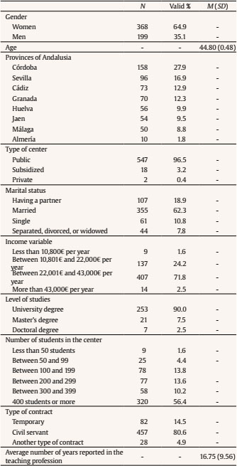 A sample of 567 subjects (64.9% women and 35.1% men) with ages between 23 and 69 years, and a mean of 44.80 years, was used (SD = 0.48). Regarding participants´ job, 10.4% were pre-school teachers, 39.2% primary school teachers, 49.9% secondary school teachers, and finally, 0.5% were adult education teachers. More details regarding the sample can be found in Supplementary Table 1.