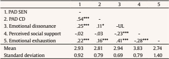Several studies relate dissonance and emotional exhaustion. For instance, Kwak et al. (2018) showed that police officers who were exposed to more demanding emotional roles presented higher levels of exhaustion. In the same way, various studies carried out with health professionals confirmed the aforementioned relationship between emotional dissonance and exhaustion (Andela & Truchot, 2017; Andela et al., 2016; Bakker & Heuven, 2006).