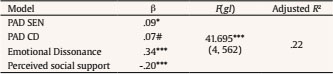 b) Emotional support moderated the relationship established between emotional dissonance and emotional exhaustion: unconditional interaction test, ΔR2 = .01, F(1, 561) = 7.655, p < .01, confirming H4b.