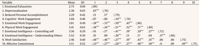 Means, standard deviations, and intercorrelations were computed for all variables to test the hypothesised relationships between emotional intelligence, work satisfaction, affective organizational commitment as well as burnout and work engagement.