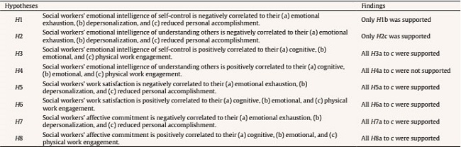 Social workers with high emotional intelligence of controlling self are more likely to work engaged cognitively, emotionally, and physically. On the other hand, they are less likely to treat clients as objects, and to feel less accomplished about how one’s job can be performed. In addition, work satisfaction is a powerful predictor and has an additional effect on all three factors of burnout, as well as affective commitment is a powerful predictor and has an additional effect on all three faces of work engagement.