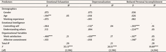 The impact of emotional intelligence on burnout varied depending on the three factors of burnout: emotional intelligence of controlling self was a negative predictor of depersonalization and reduced personal accomplishment, while emotional intelligence of understanding others was a negative predictor of reduced personal accomplishment only. Moreover, the organizational variable work satisfaction was a powerful negative predictor of all three factors of burnout and another organizational variable, whereas affective commitment was a negative predictor of reduced personal accomplishment.