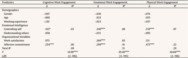 For cognitive work engagement, emotional intelligence of controlling self and affective commitment proved to be very good positive predictors. The strongest predictor was “affective commitment”, that showed that β was .254 and ∆R2 was .06, with a significant p < .001. The second predictor was “emotional intelligence of controlling self”, that showed that β was .163 and ∆R2 was .03, with a significant p < .05. These variables combined and formed as powerful predictors (R2 =.09, F = 10.90, p < .001).
