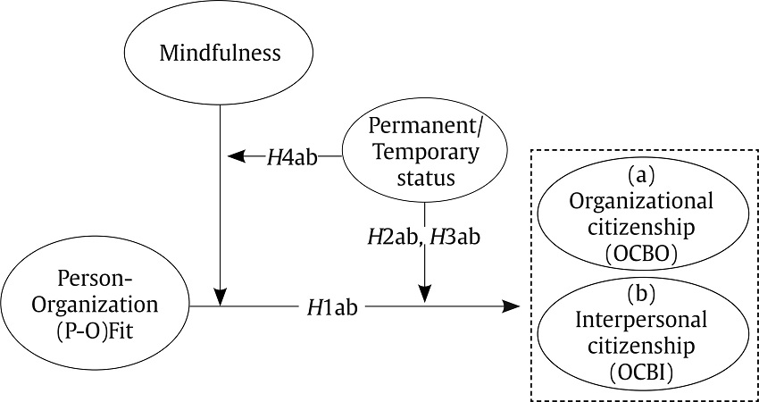 H4ab: Mindfulness moderates the positive relationships between P-O Fit and (a) OCBO and (b) OCBI, with such relationships being amplified for temporary employees and weakened for permanent employees.