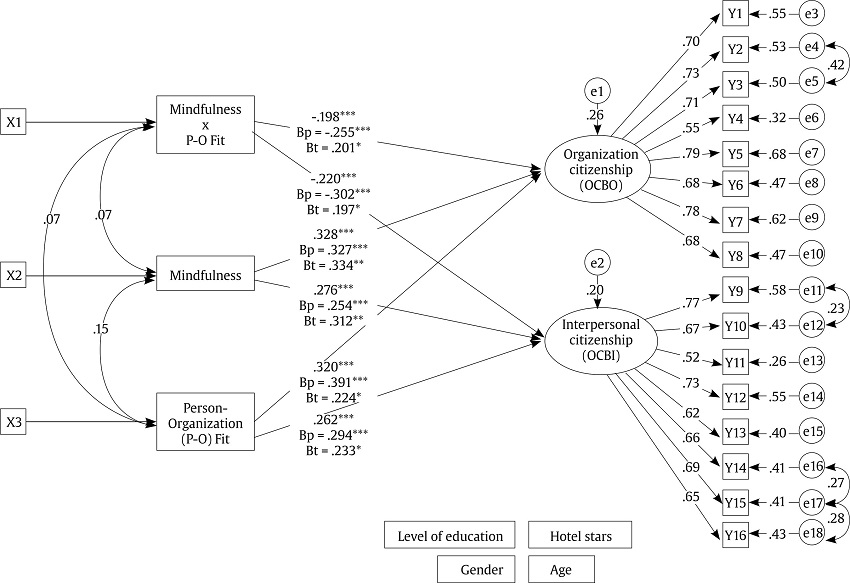 AMOS 22 software was used to perform confirmatory factor analysis (CFA). Table 2 presents the CFA results, where the modification index outputs identify the more strained parts of the CFA model. Thus, the residual correlations between the residual terms e4 and e5, e11 and e12, e16 and e17, and e17 and e18 were considered. The CFA on the remaining items (Cmin = 492.913, df = 267, p < .001; Cmin/df = 1.846; CFI = .928; SRMR = .0569; RMSEA = .054) showed a CFI (comparative fit index) above .90, but with SRMR (standardized root mean square residual) and RMSEA (root mean square error of approximation) slightly above .05. However, as Hu and Bentler (1999) suggest, an SRMR and an RMSEA between .05 and .08 in no way suggest an unacceptable fit, so the uniqueness of the four variables can be supported (Table 2). The uniqueness and validation of the factor structure of each of these variables in this study is in line with extensive previous research in which the instruments for OCBO, OCBI (Elche et al., 2020), trait mindfulness (Neff et al., 2019), and P-O Fit (Jehanzeb & Mohanty, 2018; Ruiz-Palomino et al., 2013) revealed their uniqueness against other multiple different factors.